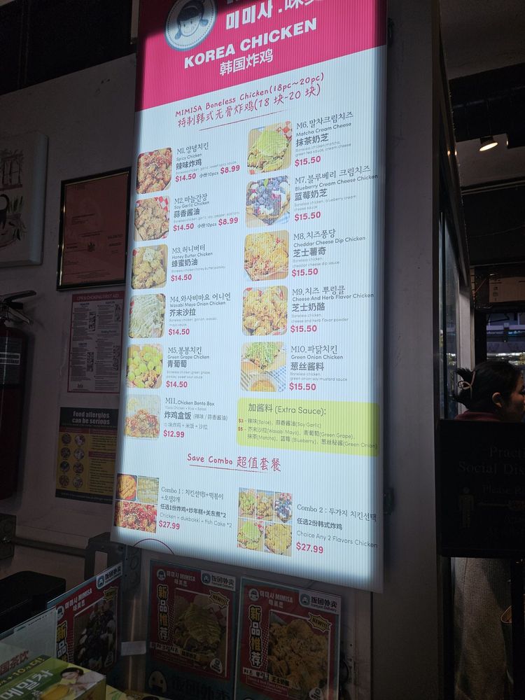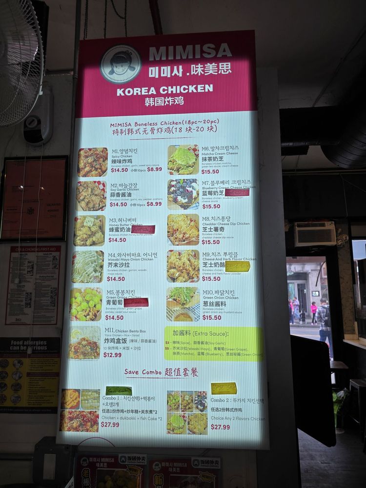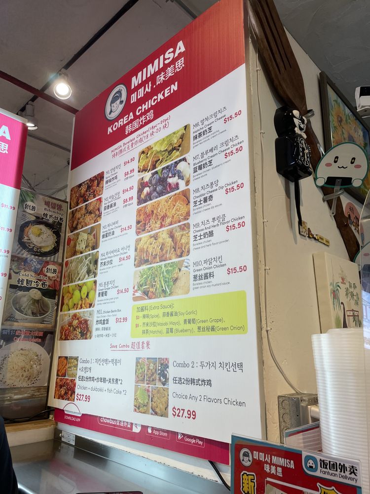 Welcome to Mimisa, a vibrant Korean eatery located at 136-21 Roosevelt Ave, Queens, NY. Offering an exciting array of dishes, this hidden gem is celebrated for its unique Korean fried chicken that combines inventive flavors and comfort. Can't-miss items include the Cheese Herb Flavor Chicken and the intriguing Blueberry Cheese Fried Chicken, each priced at $19.37.